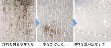 撥水性…水を弾くため、汚れの下に水が入り込めず、汚れがそのまま残ったり、一部の汚れが濃縮されて「雨だれ跡」になったりしやすい。
