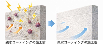 親水コーティング…表面に常に空気中の水分をわずかに保持しており、静電気が起きにくいため、ホコリや砂が吸着しにくいのが特徴です。